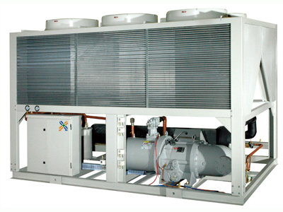 风冷螺杆式机组因其关键部件-压缩机采用螺杆式故名风冷螺杆式冷水机,机组由蒸发器出来的状态为气体的冷媒;经压缩机绝热压缩以后,变成高温高压状态。被压缩后的气体冷媒,在冷凝器中,等压冷却冷凝,经冷凝后变化成液态冷媒,再经节流阀膨胀到低压,变成气液混合物。其中低温低压下的液态冷媒,在蒸发器中吸收被冷物质的热量,重新变成气态冷媒。气态冷媒经管道重新进入压缩机,开始新的循环。这就是冷冻循环的四个过程。也是螺杆式冷水机的主要工作原理。